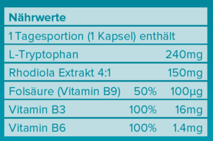 L-Tryptophan 45.4% (240 mg), Rhodiola Extrakt 4:1 28.4% (150 mg), Vitamin B3, Trennmittel: Reisextrakt,
